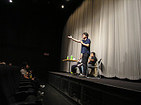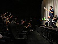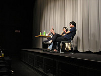 ↑は開演前のようす。手前の人が佐藤順一さんです。細田さんはコンテ本にサインしてます。