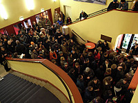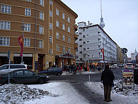 やがて、開場を前に入り口にお客さんが集まり始めました。バビロンベルリンミッテは、旧東ドイツ側に位置する映画館。後ろに放送塔が見えます。